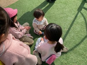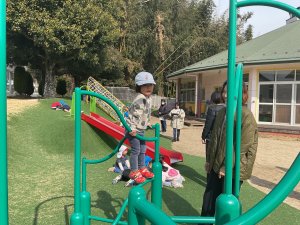 今日は、お天気も良く暖かかったので戸外で遊びました。急な斜面を登ったり滑ったり、いろいろな遊具にも挑戦して全身を動かして遊びました。こども園の園児さんとも交流をする姿が見られ、楽しい時間を過ごしました。