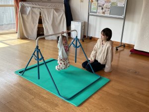 今日は、室内で運動遊びをしました。雲梯や鉄棒にぶら下がる長さを競争したり、トンネルを順番にくぐったりトンネルの中に入ってトンネルごと転がったりして、子ども同士一緒に楽しむ姿が見られました。