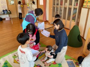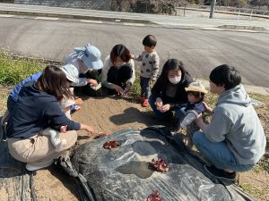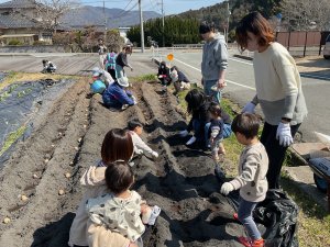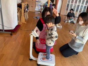 今日は、身体計測をしてから畑で人参の種を蒔いたりジャガイモを植えたりしました。昨年の栽培経験もあり、野菜の成長を楽しみに植える姿も見られました。そして、今年度最後の身体計測だったので、身長、体重の計測と手形もして、1年の成長を感じることができました。