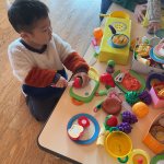 今日は、ままごと遊びを楽しみました。「みんなで一緒に作ろう」と、お野菜や果物を切って、みんなで楽しくお料理をしました。「どうぞ」「おいしいね」などとやり取りをしながらみんなで楽しい時間を過ごしました。 ...